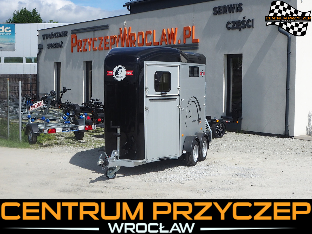 Oferujemy na sprzedaż NOWĄ przyczepę dwuosiową, hamowaną dwukonną TOURING Z RAMPĄ PRZEDNIĄ, dachem poliestrowym.