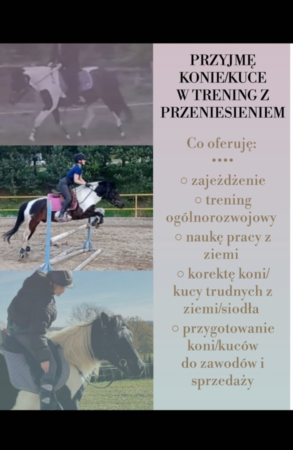 ????????Możliwość wstawienia konia do zaprzyjaźnionego pensjonatu na czas treningu konia (wolny wybieg, siano 24/h, żywienie według wytycznych właściciela, podstawowa infrastruktura bez hali, 800 zł/mies)