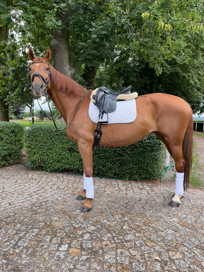 Sabrina jest pięknie zbudowaną, ramową klaczą o cudownym usposobieniu. Obdarzona jest bardzo dobrym ruchem w trzech chodach a swojemu potomstwu przekazuje także bardzo dobrą technikę skoku. Została przez nas zakupiona pięć lat temu z niemieckiej stadniny Bonhomme gdzie najpierw była klaczą sportową a potem hodowlaną. Sprzedaż klaczy związana jest tylko i wyłącznie z powielaniem puli genowej - na miejscu do obejrzenia jej potomstwo: 2 klacze ujeżdżeniowe i jeden ogierek z linii skokowej. Sabrina jest bardzo dobrą i spokojną matką.