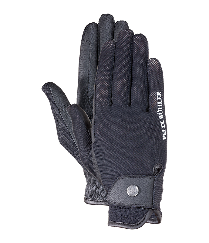 Wyjątkowo lekkie i oddychające letnie rękawiczki jeździeckie z elastycznym grzbietem z siateczki i syntetycznej skóry PU na dłoni. Elastyczny pas z zapięciem na rzep z wysokiej jakości guzikiem Felix Bühler i wzmocnieniem w obszarze wodzy. Górna część dłoni 80% poliester, 20% elastan. Dłoń 51% nylon, 49% poliuretan.