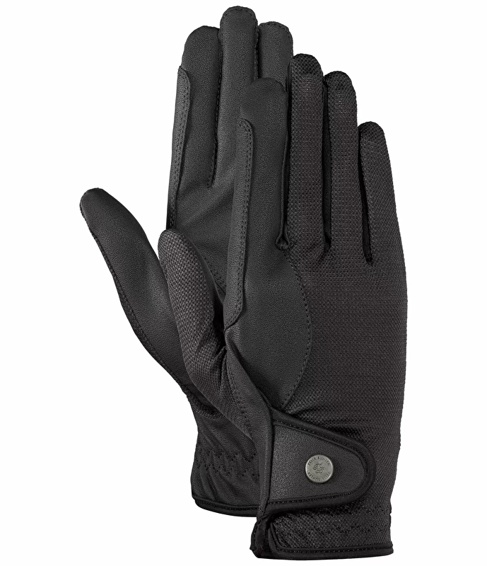 Nowoczesne i sportowe letnie rękawiczki jeździeckie z elastycznym grzbietem wykonana z siateczki i oddychającej skóry syntetycznej PU na dłoni i palcu wskazującym. Elastyczny pas z zapięciem na rzep i wzmocnieniem w okolicy wodzy. Wierzchnia część dłoni 100% nylon. Dłoń 60% poliester, 40% poliuretan.
