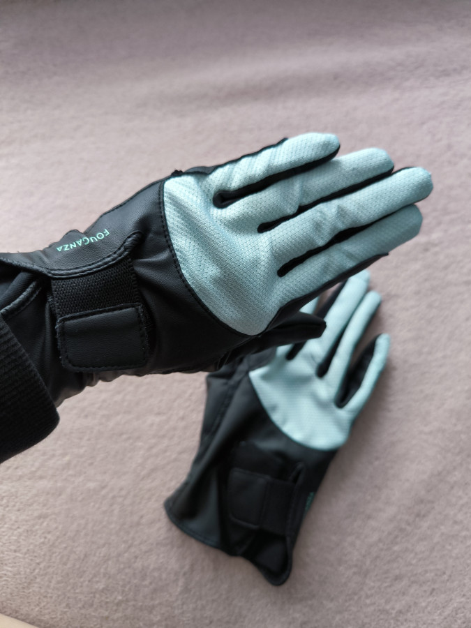 Rękawiczki jeździeckie od Fouganza. Czarno błękitne. Bardzo ładnie się prezentują. Są z Ala skórki i bardzo wygodne po założeniu. Nie uwieraja i się dopasowują do dłoni. W miejscu błękitu mają coś na wzór siateczki więc są też oddychające. Na nadgarstku dodatkowy material elastyczny więc też łatwo dopasowac. Rzep mocny. Bardzo fajne. A stan jest idealny. Rozmiar około XS