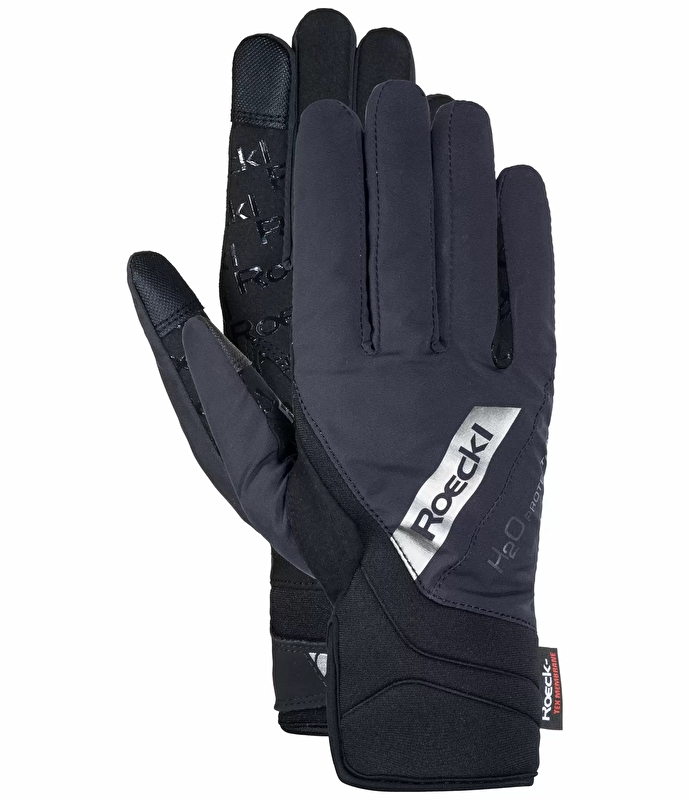 Wodoodporne rękawice WAREGEM zapewniają idealną, przyjemną i wygodną ochronę przed warunkami pogodowymi podczas zimnych, deszczowych dni w stajni i na koniu. Te wąsko skrojone rękawice jeździeckie pasują jak druga skóra i są wyposażone w niezawierający PFC, wysoce oddychający i elastyczny laminat VaporFlex na wierzchu dłoni. Dłoń jest wykonana z wytrzymałego syntetycznego zamszu DURADERO i posiada rozległą silikonację, aby zapewnić antypoślizgowy chwyt wodzy. Model posiada również trwale wodoodporną i oddychającą MEMBRANĘ ROECK-TEX, która zapobiega wychłodzeniu dłoni w bardzo niesprzyjających warunkach pogodowych, oraz miękką, szybkoschnącą i regulującą klimat wyściółkę Easy-Dry, która zapewnia dodatkowe ciepło i wygodę. Praktyczne i funkcjonalne: warstwy materiału na dłoni zostały misternie sklejone, aby zapobiec ich przesuwaniu się, gdy wodze są w ruchu. Funkcja TOUCHSCREEN COMPATIBLE na kciuku i palcu wskazującym gwarantuje, że rękawice pozostaną na swoim miejscu podczas korzystania ze smartfona. Łatwe zapięcie na neoprenowym mankiecie zapewnia, że rękawica WAREGEM ściśle i niezawodnie otacza nadgarstek. Ponadto, ponieważ jeźdźcy doceniają możliwość zachowania poczucia stylu podczas uprawiania swojej ulubionej rozrywki, ROECKL umieścił metalowe aplikacje z tyłu dłoni.