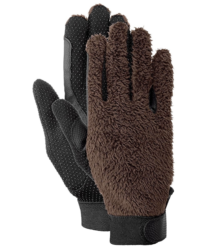 Rękawica jeździecka z długim włosiem, która jest wyjątkowo puszysta i ciepła. Wierzch dłoni wykonany z miękkiego pluszowego polaru. Dłoń i palce z ćwiekami z PVC. Wzmocnienia wodze, połączony elastyczny pas na rzep. 100% poliester, 95% poliester w dłoni, 5% elastan.