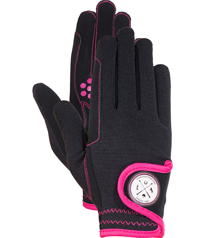 Sportowe i oddychające dziecięce rękawiczki jeździeckie z kontrastowymi szwami i modnym logo STEEDS na zapięciu na rzep. Dłoń z nadrukiem i wzmocnieniem w okolicy wodzy. Bekhend 98% nylon, 2% elastan. Wnętrze dłoni 55% poliuretan, 45% poliester.