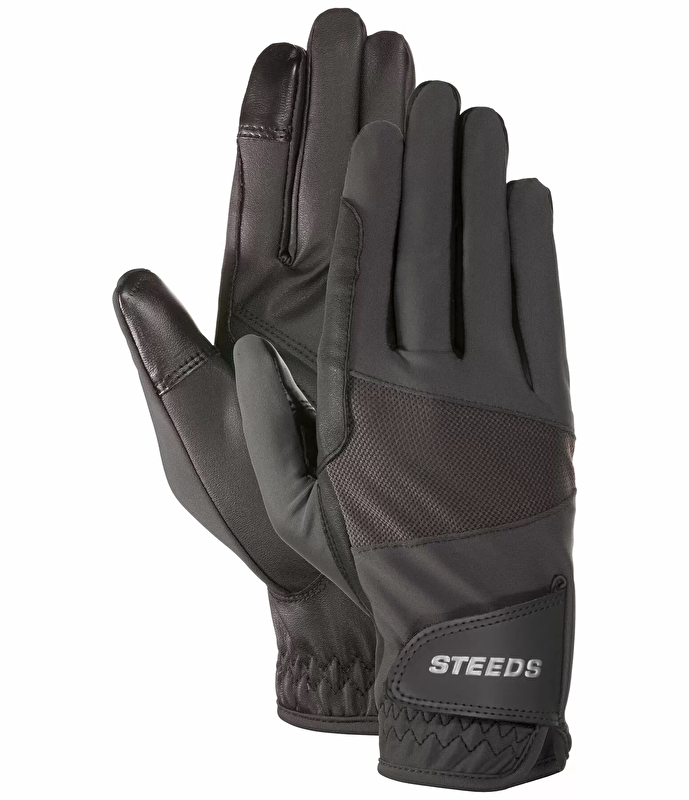 Lekkie i sportowe letnie rękawiczki jeździeckie z elastyczną wstawką z oddychającej siateczki i delikatnego nylonu. Wewnętrzna część dłoni wykonana z antypoślizgowej syntetycznej skóry PU dla optymalnego trzymania wodzy. Elastyczny pas i zapięcie na rzep z metalicznym logo STEEDS. Wzmocnienie w okolicy wodzy. Backhand 70% nylon, 30% elastan. Wnętrze dłoni 80% poliuretan, 20% poliester.