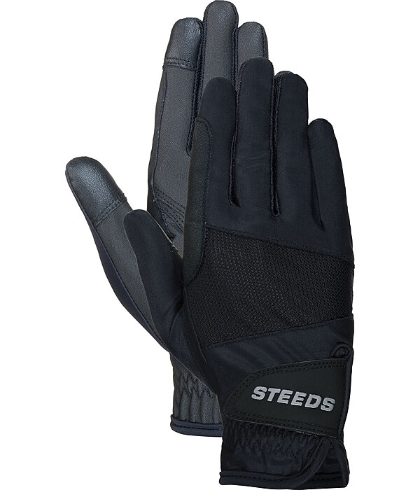 Lekkie i sportowe letnie rękawiczki jeździeckie z elastyczną wstawką z oddychającej siateczki i delikatnego nylonu. Wewnętrzna część dłoni wykonana z antypoślizgowej syntetycznej skóry PU dla optymalnego trzymania wodzy. Elastyczny pas i zapięcie na rzep z metalicznym logo STEEDS. Wzmocnienie w okolicy wodzy. Backhand 70% nylon, 30% elastan. Wnętrze dłoni 80% poliuretan, 20% poliester.