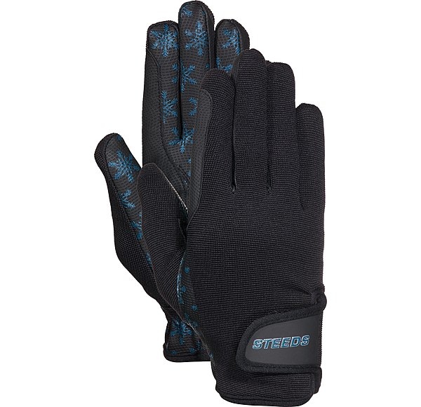 Szykowne zimowe rękawiczki jeździeckie z elastycznym wierzchem. Strona wewnętrzna dłoni wykonana z matowej skóry syntetycznej PU, z nadrukiem płatków śniegu. Ciepła polarowa podszewka i dyskretne logo STEEDS na zapięciu na rzep.