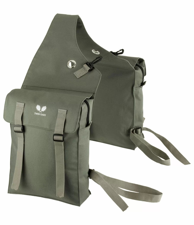 Podwójna sakwa z dwiema kieszeniami zapinanymi na zamek Mocowana na zatrzaski PVC, nylonowe oczka i paski mocujące. Wodoodporna. Wymiary: 25 x 32 x 9 cm.