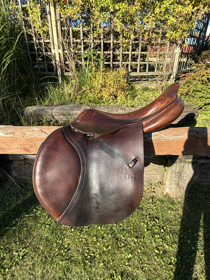 Sprzedam używane siodło CWD, parametry na ostatnim zdjęciu. Przeze mnie niewiele używane, kupione jako zapasowe. Wady widoczne na zdjęciach, łęk wyszedł ze szlufki, jest cały ale należy go przymocować. Siodło posiada wady kosmetyczne, spokojnie do przerobienia u rymarza. Siedzisko mogło być niegdyś zalane, stąd prawdodpobnie przebarwienia, ale skóra cała, terlica w porządku.