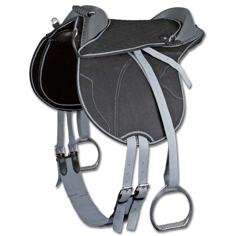Siodło dla kucyków dla dzieci, w komplecie z akcesoriami. Podkładka dla kucyków, odpowiednia dla dzieci z siedziskiem 16.5". Bardzo lekkie, z miękką wyściółką i z przodu i z tyłu do góry. Gumowana rączka dla pewnego chwytu. Kłąb zmienny dzięki łożyskom, wymienny kłąb, przednie miejsce na kolano z rzepem, szlufki na podogonie, nylonowe sprzężenie zwrotne. W zestawie rączka, popręgi, strzemiona i puśliska.