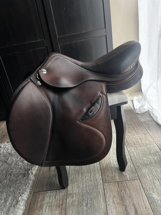Siodło ERREPLUS CA, kolor Cocoa (brązowy), rozstaw łęku 33, rozmiar siedziska 17 cali, wypełnienie wełniane. Siodło używane na jednym koniu, zakupione przeze nas od polskiego dystrybutora Erreplus (Fit and Ride), pasowane przez saddle fitera na mojego konia. Bardzo wygodne i komfortowe, zadbane, regularnie czyszczone i smarowane, ma normalne ślady użytkowania i jedno wytarcie widoczne na zdjęciu.
