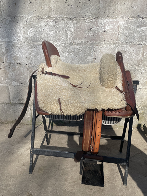 Sprzedam używane bardzo wygodne tradycyjne siodło hiszpańskie Doma Vaquera MD Sevilla. Takich siodeł używają hiszpańscy pasterze do długich wyjazdów i prac wykonywanych w terenie z bydłem. Siodło posiada zalea czyli naturalne futro dzięki czemu jest bardzo wygodne i chroni przed zimnem. Fajna opcja zwłaszcza podczas długich zimowych terenów. Zaleta jest również stabilność dzięki szerokim panelom tył siodła nie przesuwa się na boki. Siodło sprzedawane jest wraz z oryginalnym osprzętem: skórzany popręg, puśliska, metalowe hiszpańskie strzemiona, podogoniem i zalea. Stan jak na zdjęciach.