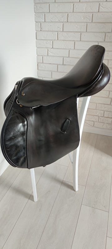 Na sprzedaż budżetowe siodło skokowe, na każdą kieszeń. Marka angielska, Derby House. Rozmiar to 17,5 cal łęk M według Daw Maga. Siodło w stanie dobrym, posiada widoczne ślady użytkowania, odbarwienia skóry jednak technicznie jest całkowicie sprawne. Siodło posiada nowe przystuły. Wypełnienie jest wełniane, nie ubite. Długość tybinki 35cm. Długość paneli 46cm. Szerokość tunelu na kręgosłup 5-8cm.