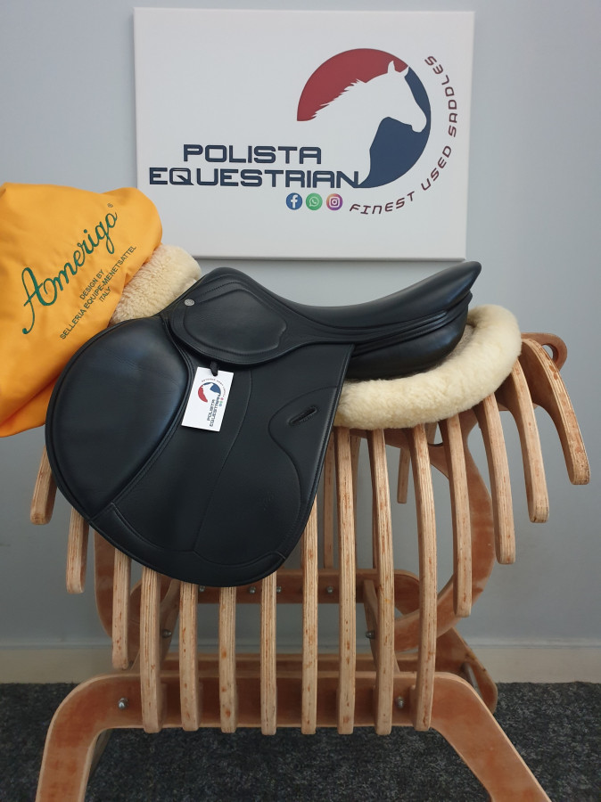 Czarne siodło skokowe Amerigo Octave P. Topowa skóra Amerigo. Wypełnienie paneli wełniane, rozmiar 17.5", tybinki 33.5 cm, rozstaw +1 (odpowiada 34 wg Prestige ) W całości wykonane ze skóry Pinerolo. Siodło w doskonałym stanie, prawie jak nowe.