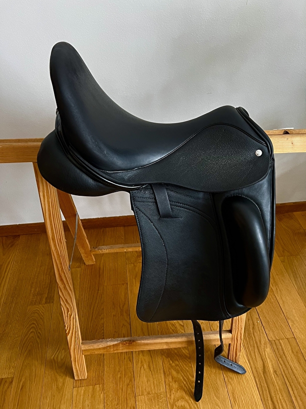 Na sprzedaż siodło ujeżdżeniowe prestiżowej marki Custom, model OMNI MONOFLAP. Jestem pierwszą właścicielką siodła. Jest w stanie idealnym. Ze względu na koniec mojej przygody jeździeckiej było bardzo mało używane:) Całość wykonana z niezwykle elastycznej skóry bawolej co zapewnia doskonałe dopasowanie. Konstrukcja z pojedynczą klapą i głębokie, obszerne siedzisko zapewniają bliski kontakt. Siodło jest wyjątkowo komfortowe. Długie zewnętrzne wałki kolanowe zapewniają kontrolę i doskonalą równowagę. Oryginalny pokrowiec. Możliwość przymiarki po wpłaceniu kaucji. Łęk 26 - jest to amerykańska rozmiarówka, na załączonym zdjęciu znajduje się przeliczenie odpowiadające europejskim standardom. Rozmiar siodła 17". Poduszka kolanowa R2. Długość tybinki 15". Cena 9 900 PLN. Kupując siodło zapłaciłam 3645 euro.