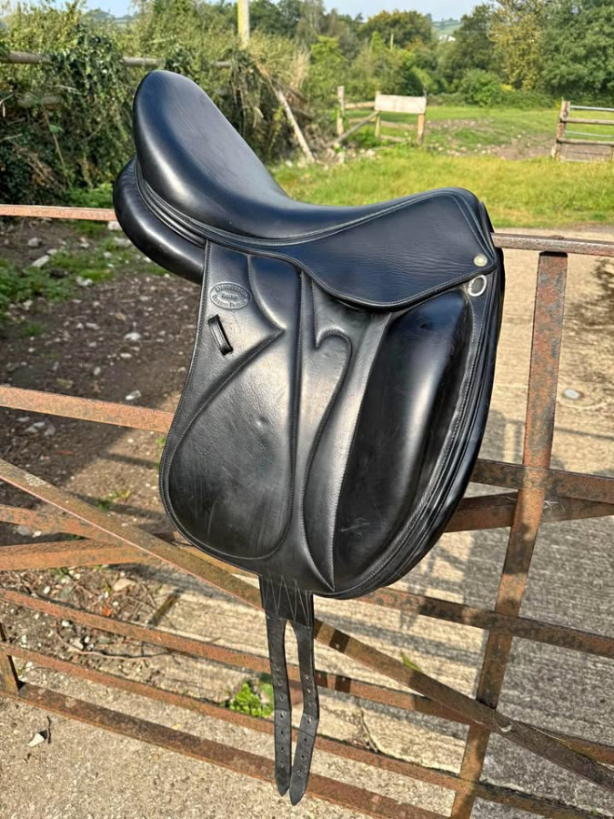 Witam. Oferuję do sprzedaży unikatowe siodło ujeżdżeniowe słynnej francuskiej firmy Devoucoux. Rozmiar 18. Jest to model Makila, o kultowym designie, to siodło z pojedynczą tyczką i głębokim siedziskiem, które podkreśla harmonię między jeźdźcem a koniem. Dzięki ów pojedynczej tyczce, wydatnym blokom i cofniętym puśliskom, siodło Makila S gwarantuje doskonałą stabilność jeźdźca podczas chodów pod górę i przejść. Głębokie siedzisko sprawia, że jest bardziej odpowiednie dla doświadczonych jeźdźców ujeżdżeniowych. Wykonane ze skóry cielęcej lub bawolej skóry imitującej nubuk dla lepszej stabilizacji nóg i miednicy. Wyraźne bloki kolanowe i udowe oraz przesunięte do tyłu strzemiona zapewniają jeźdźcowi doskonałą stabilność i precyzyjny kontakt z nogami. Również wysunięte tyczki pozwalają jeźdźcowi na płynną pozycję. Elastyczne panele D3D są idealnie symetryczne, co pozwala na równomierne rozłożenie nacisku na grzbiet konia. Model zarejestrowany. Siodło w doskonałej kondycji i aparycji. firmowym pokrowcem. Zapraszam do kontaktu.
