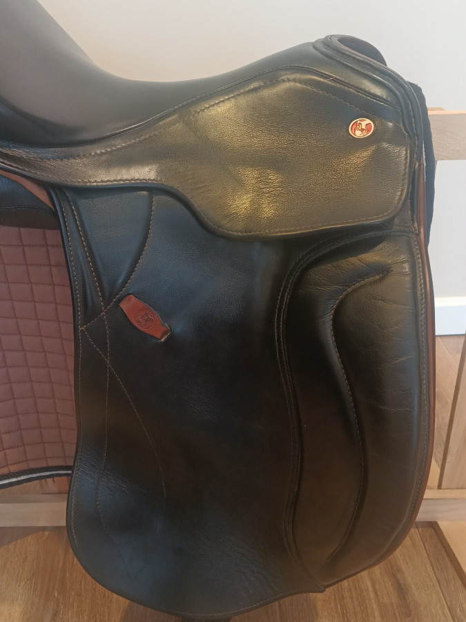 Na sprzedaż używane siodło ujeżdżeniowe Kieffer Paris Exclusive w kolorze czarnym z brązową lamówką. Siodło jest bardzo zadbane, regularnie pastowane. Siodło z głębokim siedziskiem i dużymi, ukształtowanymi anatomicznie klockami kolanowymi. Polecam, bardzo wygodne.