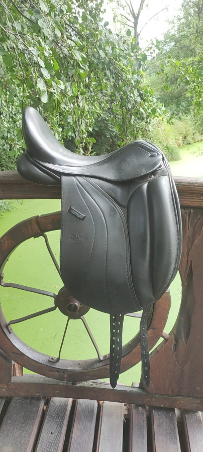 Na sprzedaż bardzo wygodne siodło ujeżdżeniowe brytyjskiej firmy Monarch 17 cali, aktualnie lęk MW 30cm, mam również NM 28cm. Idealne na proste plecy z zaznaczonym kłębem, miękkie wełniane wypełnienie oraz wymiennie lęki, na krótszych panelach. Siodło bardzo zadbane, rok produkcji 2021, jedyne ślady użytkowania widoczne na tybinkach. Wykonane z bardzo dobrej miękkiej skóry, wyposażone w duży klocek kolanowy mocowany na rzep co pozwala dostosować go indywidualnie do nogi lub wymienić na inny. Głębokie siedzisko przez co jest to bardzo mała 17stka, raczej 16,5.