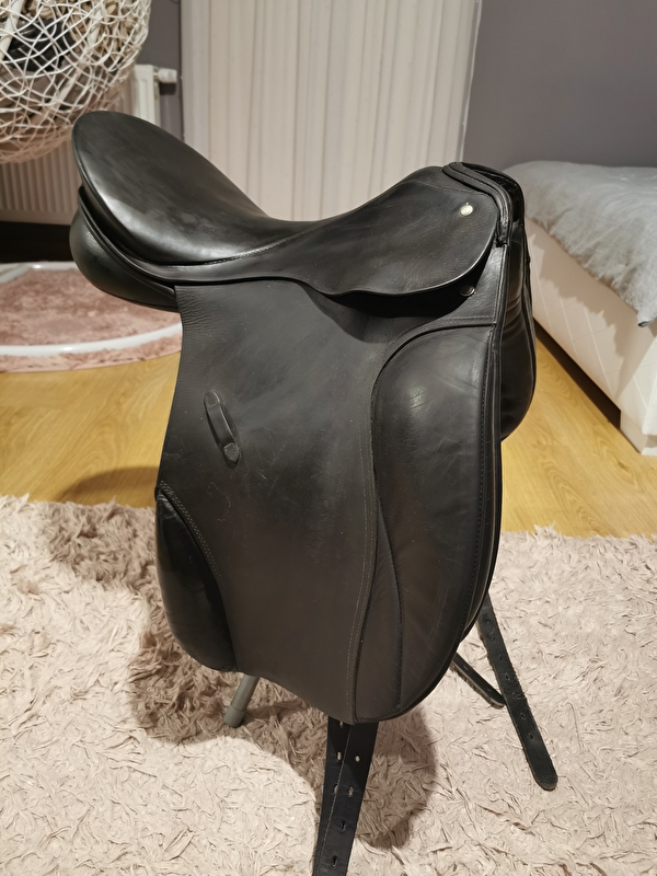 Sprzedam siodło firmy Passier Grand Gilbert rozmiar siedziska 17 cali, łęk 26-27 cm (na wykłębionego konia) z wyciętym łękiem. Zadbane siodełko. Miało dorabianie tylne klocki jeden kocuszek delikatnie "uszczypnięty"- zdjęcie. Wymieniane pszystuły na nowe oraz w kwietniu było sprawdzone pod względem sprawności konstrukcji i całkowicie wymienione wypełnienie paneli (wełna) u saddlefittera esiodła (koszt ok 600zł). Siodło używane sporadycznie, jako "odskocznia" od skokowego, ale niestety koń się rozbudował i potrzebuje szerszego. Super wygodne, usadzajace, ale nie blokujące ruchów jeźdźca. Chętnie wymienię się na szerszą ujeżdżeniowkę ok. 28-29 cm, albo z systemem wymiennych łęków.
