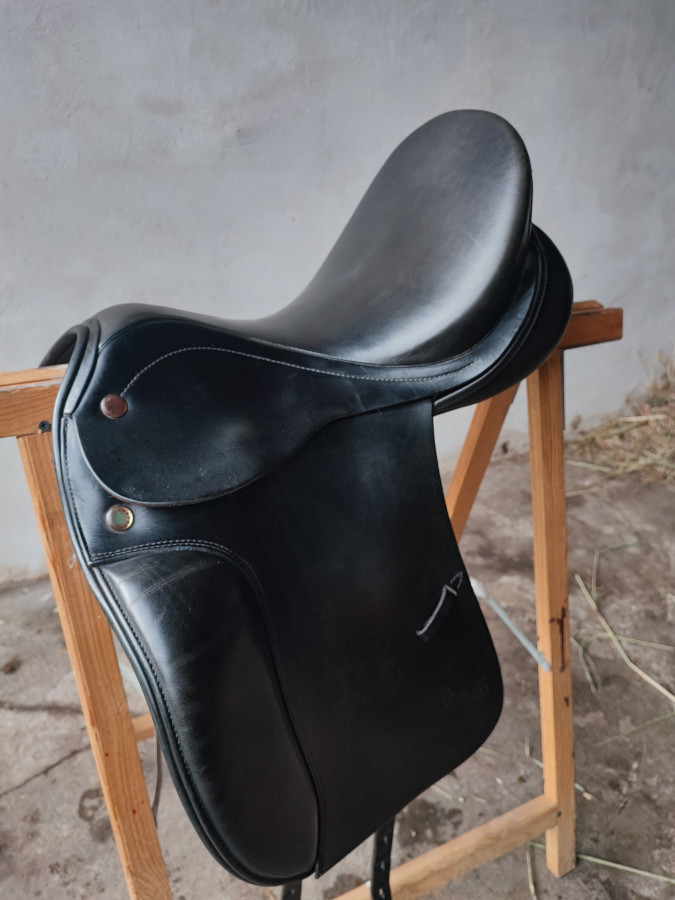 Sprzedam używane siodło ujeżdżeniowe Prestige Lucky Dressage, rozmiar siedziska 16 cali, łęk 33. Posiada normalne ślady użytkowania, zadbane, czyszczone i konserwowane. Przystuły całe, nie jest zniszczone. Klocki kolanowe na rzep- możliwość regulacji. Krótka tybinka, fajna dla dzieci/ młodzieży lub niewysokich osób.