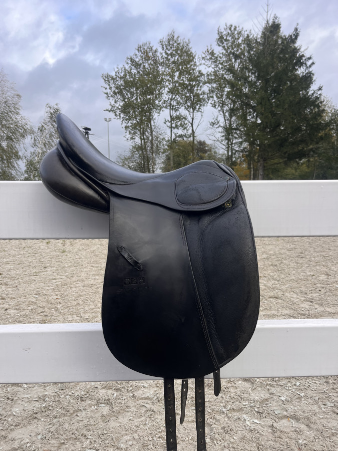 Siodło ujeżdżeniowe Stubben, 17,5. Mimo widocznych lat użytkowania to siodło nadal jest w pełni sprawne i zdatne do dalszego jeżdżenia. Wypełnienie nadal miękkie, kwestia dostosowania pod konkretnego konia. Bardzo wygodne. Przystuły rozdwajają się.