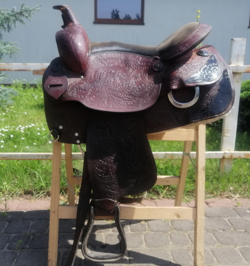 Sprzedam piękne, zdobione siodło westernowe. Siedzisko 17 cali, reszta wymiarów podana na ostatnich zdjęciach. Pasowało mi zarówno na konika polskiego jak i konia zimnokrwistego. Stan siodła dobry, nadaje się do dalszego użytku. Regulacja strzemion działa jak powinna. Jedyne wady to lekko postrzępiona przystuła od strony materiałowej, lekko zardzewiała sprzączka od jednego strzemienia,lecz przy tym sprawna, rozwarstwienie się strzemienia w miejscu łączenia, niewidoczne gołym okiem oraz zużyty horn. Wady również widoczne na ostatnich zdjęciach. Do siodła dodaję pad w idealnym stanie. Wysyłka kurierem gratis. Jest możliwość wysyłki za pobraniem pod warunkiem przedpłaty samych kosztów wysyłki na konto (50 zł).