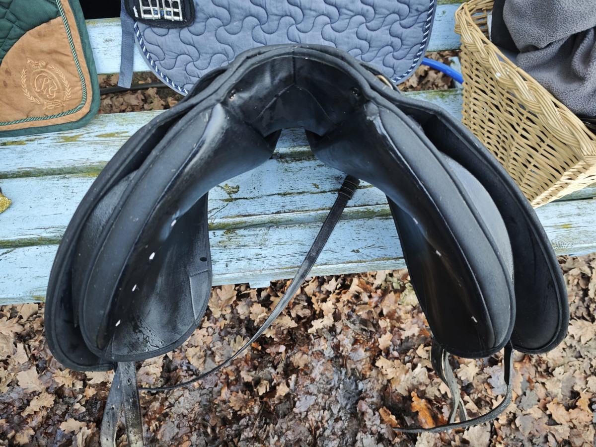 Siodło było używane w ostatnim czasie sporadycznie na jednym koniu – widać naturalne ślady użytkowania, jednak wszystko jest w pełni sprawne. Pokrycie siedziska i tybinek bez przetarć. Szwy w świetnym stanie. Ogólnie siodło ładne, wymaga przetarcia szmatką ;) dłuższy czas nieużywane.