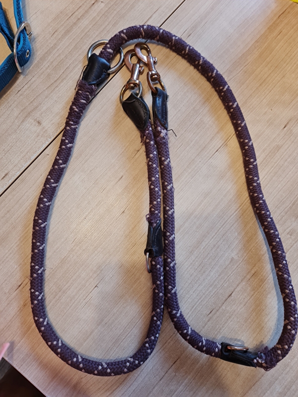 Elegancka smycz wykonana z miękkiej, dwukolorowej liny z polipropylenu z końcówkami z delikatnej, olejowanej skóry. Opcja potrójnego zapięcia. Okucia w kolorze różowego złota. Długość 200 cm.