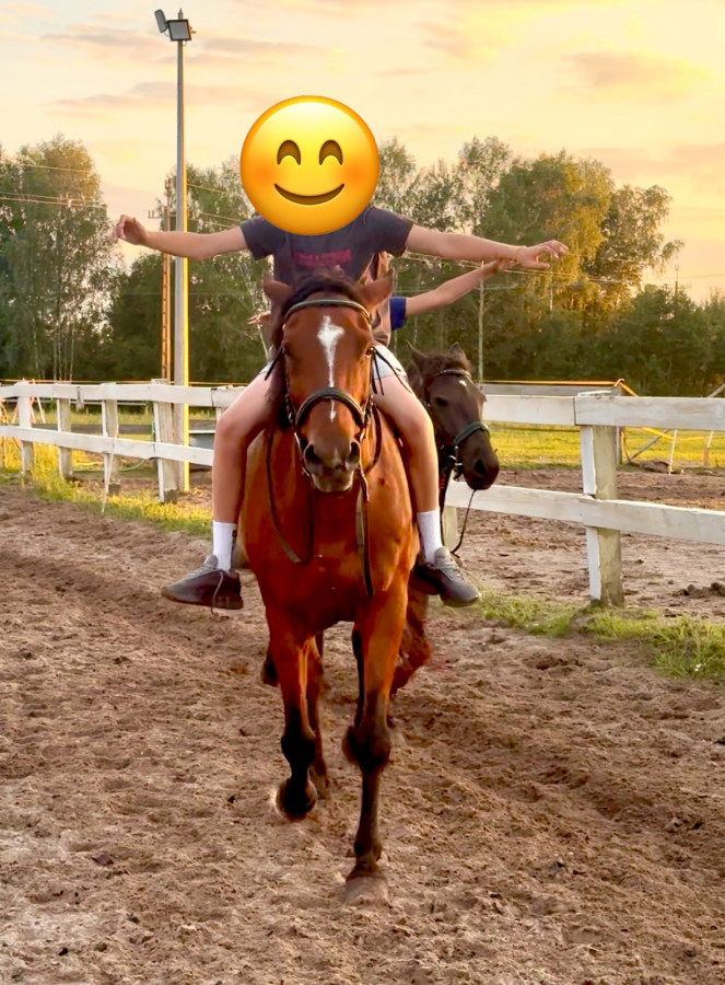 17 letnia klacz o spokojnym charakterze, grzeczna, bezpieczna, bez głupich pomysłów. Ma około 162 cm wzrostu. Świetnie sprawdzi sie w terenach oraz na placu, jako czołowa lub w zastępie. typ bomboodporny. Przy obsłudze bezproblemowa. Nie gryzie, nie kopie. Nie tka, nie łyka. Posiada paszport. Typ szlachetny.