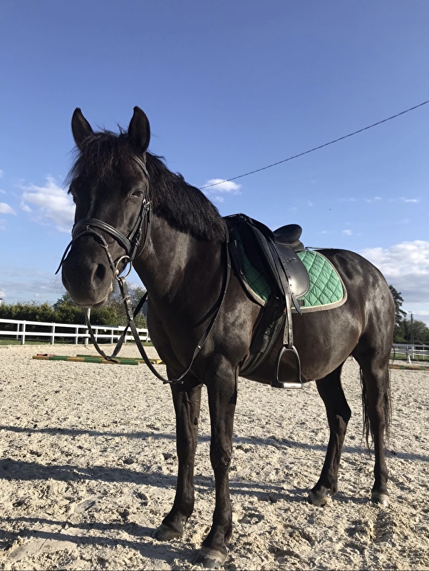 Chodzi pod siodłem, skacze pojedyncze przeszkody, jezdzi w tereny, chodzi na lonzy.