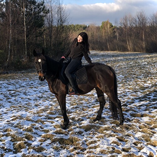Sprzedam 9-letnią klacz małopolską. Koń dla doświadczonego jeźdźca, chodzi w tereny sama jak i z innymi końmi. Jezdziłam na niej głównie w tereny, chętnie sakcze (naskakana do metra) jeżdżona czasem na cordeo, odważna nie boi się aut, psów ani innych strasznych rzeczy. Spokojna przy zabiegach pielęgnacyjnych i kowalu. Jeśli zostaje sama w stajni delikatnie tka, wystarczy aby miała innego konia obok. Roztrenowana z powodu braku czasu. Szkółkom z góry dziękuję. Kontakt po godzinie 16.