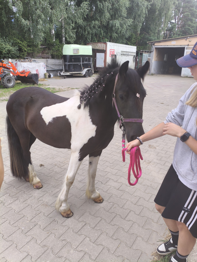 Na sprzedaż wałach w wieku 3,5 roku, po matce kucu i ojcu Gypsy Cob. Koń jest świeżo zajeżdżony, spokojny i chętny do współpracy — obecnie jeździ na nim 11-latka.