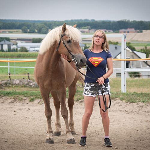 Scoobi to 6-letni haflinger, około 148 cm wzrostu. Nigdy nie kontuzjowany, nigdy nie chorował, bardzo grzeczny w obejściu, spokojny przy kowalu. W obecności człowieka nie gryzie i nie kopie, w obecności konia zdarzy mu się powalczyć.