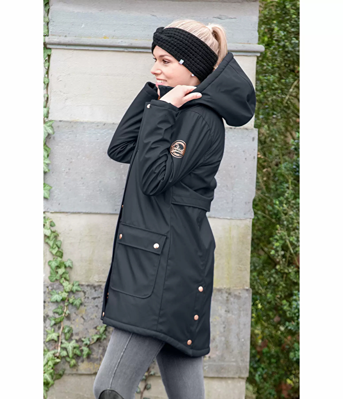 Wygodny, wodoodporny płaszcz do jazdy konnej z przytulnym pluszowym futerkiem od wewnątrz. Wodoodporna i wiatroszczelna. Ukryty dwukierunkowy zamek błyskawiczny z przodu, 2 kieszenie z klapką zapinane na zatrzaski z przodu, regulowany kaptur z możliwością zapięcia z tyłu, 2 rozcięcia jeździeckie zapinane na zatrzaski z tyłu, nadruk STEEDS na rękawie.