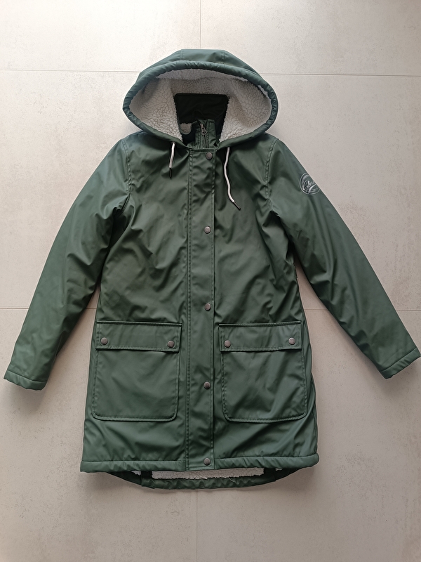 Bardzo uniwersalny płaszcz przeciwdeszczowy. Ocieplany. Materiał zewnętrzny nieprzemakalny. Wewnątrz podszyty misiem, więc płaszcz jest bardzo wygodny.