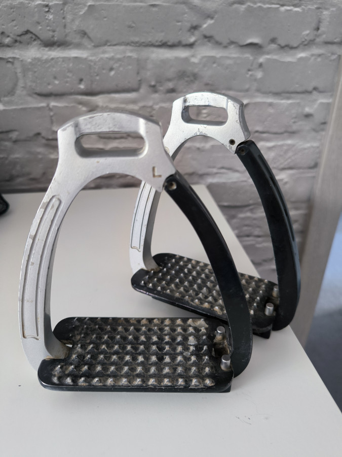 Strzemiona bezpieczne. Mają jedno ramię na mocny magnes który w razie upadku z konia mogą wysuwa sie gdy ramię się otwiera pod naporem. Matelowe cięższe dobrze stabilizują nogę. Mają lekkie Ala kolczyki które trzymają nogę w odpowiednim miejscu zapobiegając przesuwaniu. Stan jest dobry. Mają trochę odprysków farby. Czarne elementy były lekko przemalowane lecz dla zachowanie pełni koloru należałoby je przemalować jeszcze raz porządnie by dodatków pozbyć się rysek czy odprysków równiez na srebrnej części. Chyba że komuś to nie przeszkadza a liczy się bardziej z funkcjonalnością i bezpieczeństwem tych strzemion. Poza tym nie mają wad. Wszystko zostało pokazane na zdjęciach. Każde strzemię osobno z każdej strony. Uniwersalny rozmiar. Stopka 7 cm szerokość, 12 cm długość w bok od ramienia do ramienia.
