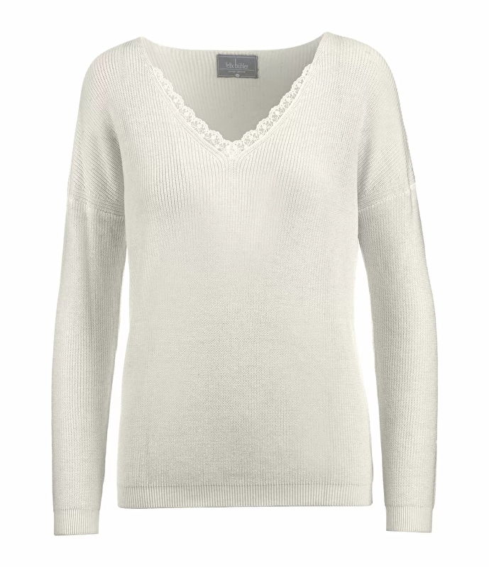 Super ładny, miękki i wygodnie skrojony sweterek z dzianiny z koronkowym detalem na dekolcie. Prążkowane mankiety i dół. 53% bawełna, 40% wiskoza, 7% nylon.