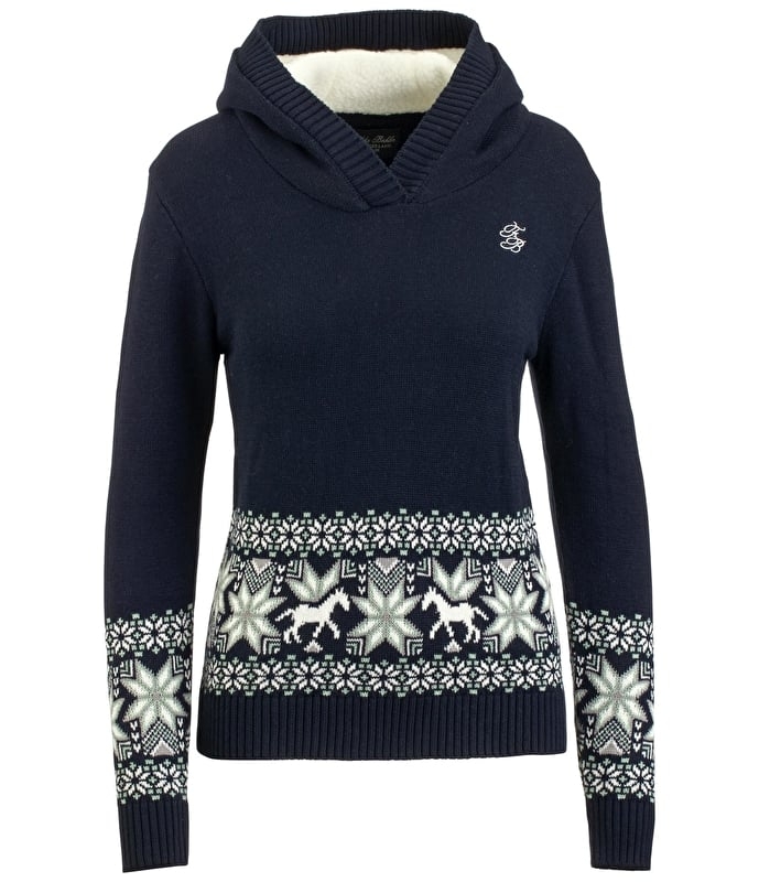 Sportowy, wyjątkowo przytulny sweter z dzianiny z kapturem w norweskie i końskie wzory. Haft Felix Bühler na piersi. Kaptur podszyty miękkim pluszowym futerkiem. 55% bawełna, 45% akryl, podszewka kaptura 100% poliester.