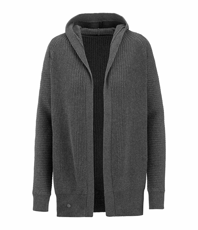 Wysokiej jakości kardigan z kapturem z ciepłej dzianiny ze szczególnie wysokim współczynnikiem przytulania. Prążkowany dół i mankiety. 53% bawełna, 40% wiskoza, 7% nylon.