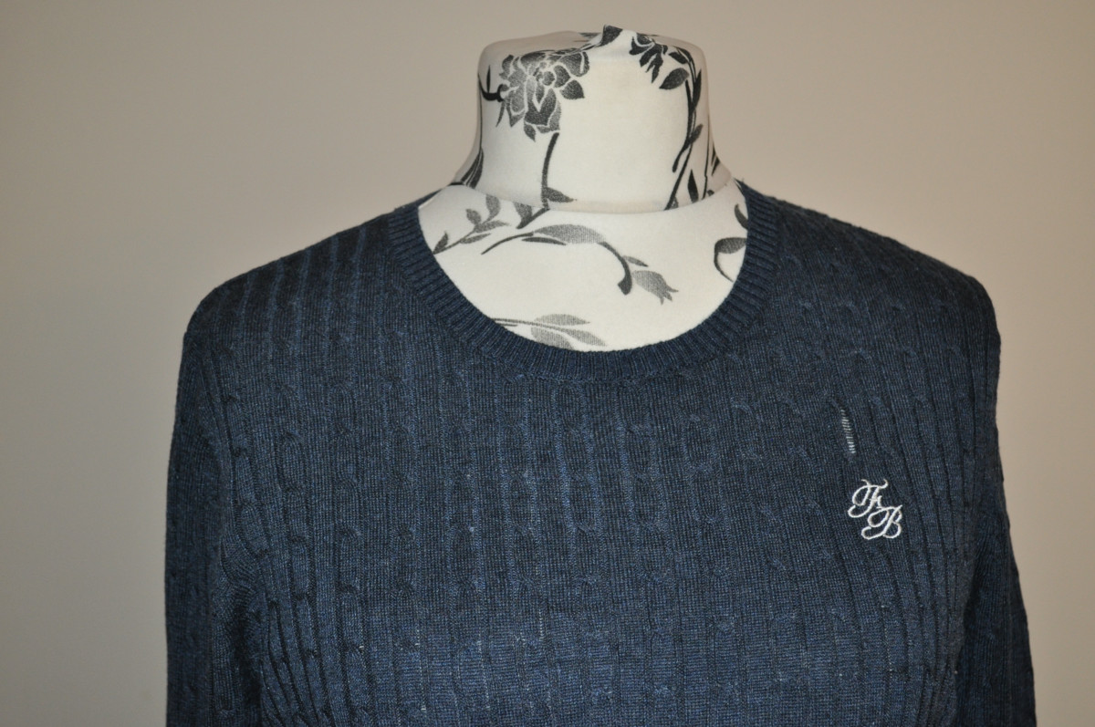 Klasyczny, bardzo miękki sweterek z okrągłym dekoltem i wzorem warkoczowym. Haft Felixa Bühlera na piersi. Ściągacze przy mankietach, ściągaczach i końcach rękawów. 50% wiskoza, 30% poliester, 20% nylon.