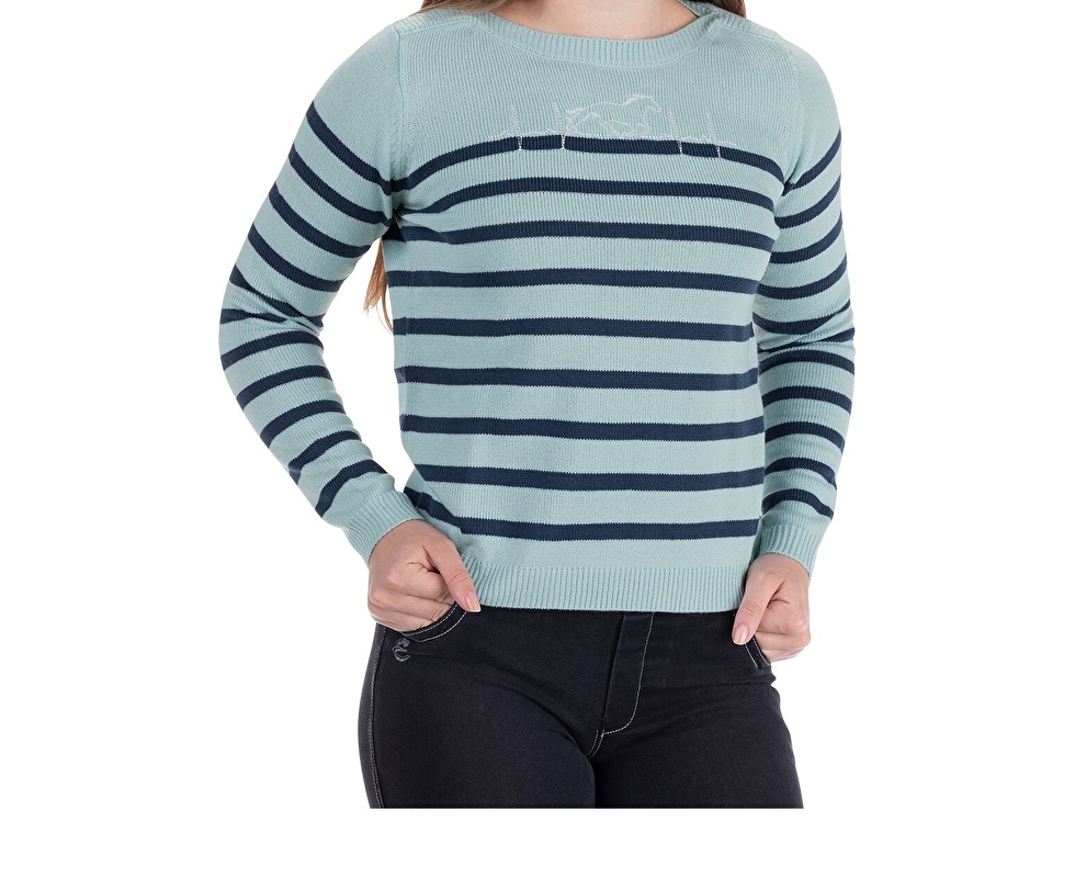 Miękki sweterek dziecięcy z dzianiny z dekoltem w łódkę. Pionowe paski, uroczy haft z biciem serca i koniem na piersi oraz ściągaczowe mankiety i dół. 100% poliakryl