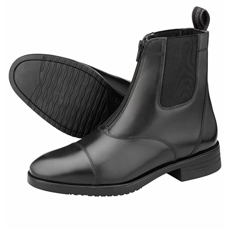 Zapinane na zamek botki wykonane ze skóry bydlęcej, teraz o ulepszonym kroju i eleganckim, dopasowanym kroju. Elastyczne wstawki po obu stronach zapewniają wysoki poziom komfortu, zamek błyskawiczny w połączeniu z pętelką do szybkiego zakładania i zdejmowania. Antypoślizgowa podeszwa zewnętrzna wykonana z gumy z obcasem przystosowanym do jazdy konnej, wyściółka wewnętrzna z materiału tekstylnego (100% poliester).