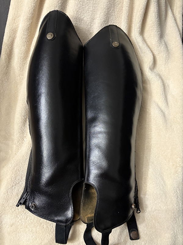 Czarne sztylpy/czapsy firmy PBK ze skóry bydlęcej. W bardzo dobrym stanie ale posiadają lekkie ślady użytkowania. Suwaki sprawne gumy również okej. Długość po suwaku 39 cm, długość po łuczku 47 cm, szerokość w najszerszym miejscu 36 cm z gumą więc trochę się rozciągną.