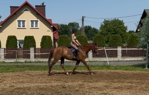 Pracuje w trzech chodach pod jeźdźcem, miękki w pysku, aktualnie na etapie szukania swojego miejsca z głową i nauki kontaktu. Szybko się uczy. Bardzo posłuszny, chodzi na głos. Aktualnie pracuje stosownie do swojego wieku, bez nadmiernych obciążeń