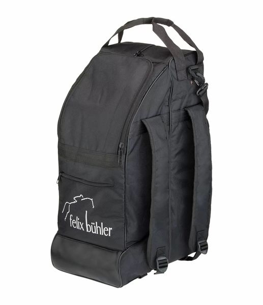 Plecak jeździecki wykonany z wytrzymałego nylonu z miękko wyściełaną przednią kieszenią na kask jeździecki i ochraniacz pleców. Duża komora na buty do jazdy konnej z otworami wentylacyjnymi, mała komora na rękawiczki, ostrogi itp. oraz długa komora na baty. Oprócz miękko wyściełanych szelek o regulowanej długości, plecak jeździecki posiada uchwyty i pasek na ramię. Spód z gumowymi nóżkami, które chronią przed zużyciem.