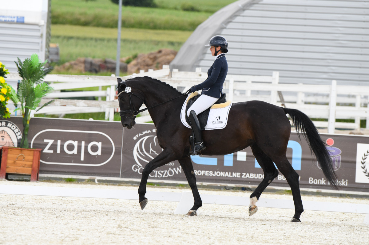 Piękna kara klacz ujeżdżeniowa o doskonałym rodowodzie. Świetny aktywny stęp, lekki kłus i galop "pod górę". Wyszkolona do klasy N-C. Kompaktowy koń z łatwością do zebrania. Klacz jest spokojna, łatwa w prowadzeniu, towarzyska. Nadaje się dla amatora, nie ma zachowań typowych dla klaczy, padokowana w stadzie. W treningu ujeżdżeniowym od dwóch lat, prosto od hodowcy. Koń sprawdzony na zawodach, wygrywała wielokrotnie w klasie P i N na 68-70% w Gościszowie, Białym Lesie, Strzegomiu i Partynicach.