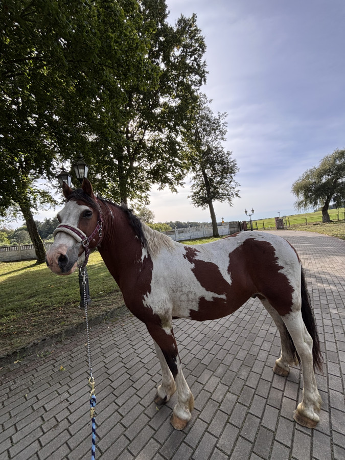 Na sprzedaż śliczny, srokaty wałach po Pinto od Welsh Coba, około 145 cm w kłębie, 10-letni. Koń o cudownym charakterze – kontaktowy, towarzyski, lubi dzieci, bardzo miły w codziennym obyciu. Chętnie współpracuje z ziemi, wychowany, spokojny, regularnie werkowany i zadbany.