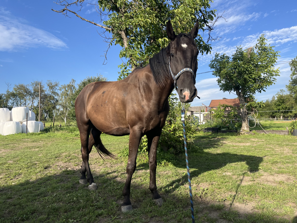 Koń jest zajeżdżony w 3 chodach,czuły na pomoce,bardzo ładnie chodzi na lonży(reaguje na głos), skakał w korytarzu, pod jeźdźcem pokonuje niewielkie przeszkody - do dalszej pracy.