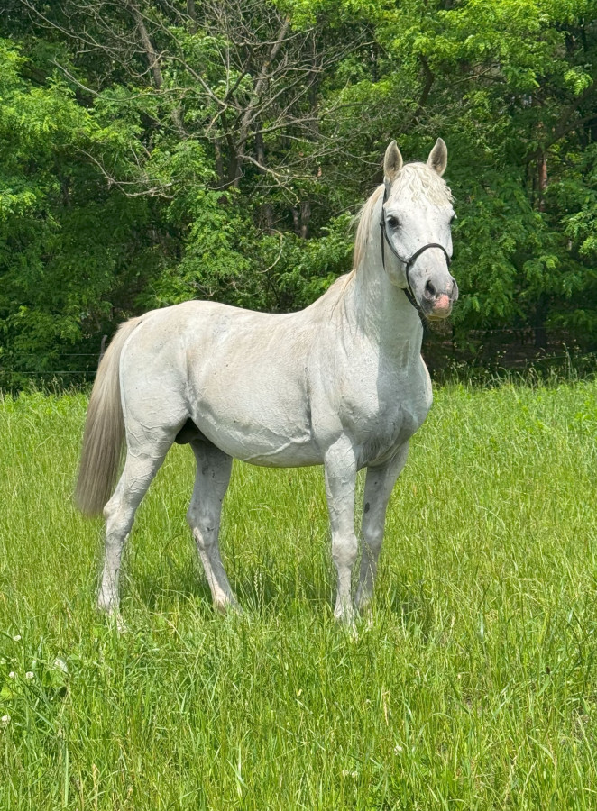 Nowego domu szuka wspaniały siwy w minimalną hreczke wałach Arabski. (Kastrowany 01.08.2025) Ma urocze mini brązowe plamki